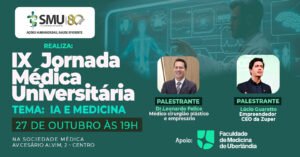 Na última segunda-feira, 27 de outubro, a Faculdade de Medicina de Uberlândia (FAMEU) teve a honra de apoiar mais uma edição da IX Jornada Médica Universitária, evento promovido pela Sociedade Médica que reuniu estudantes, docentes e profissionais da área da saúde em torno de um tema cada vez mais presente no cenário científico: “Inteligência Artificial e a Medicina”.